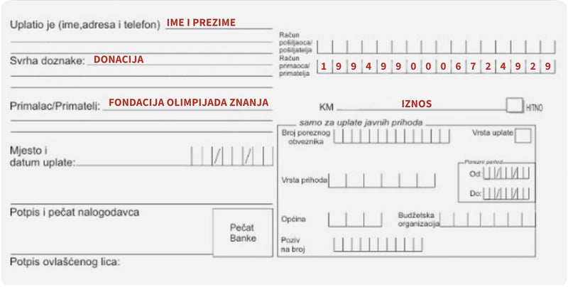 'Za popunjavanje uplatnice za donaciju Fondaciji Olimpijada znanja u BiH, potrebno je unijeti sljedeće podatke: